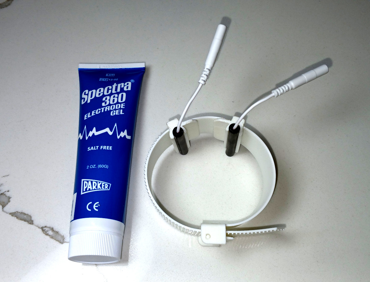 - White TPU Wrist Strap with Conductive Rubber Electrodes (alternative option to TENS pads, use electrode gel)